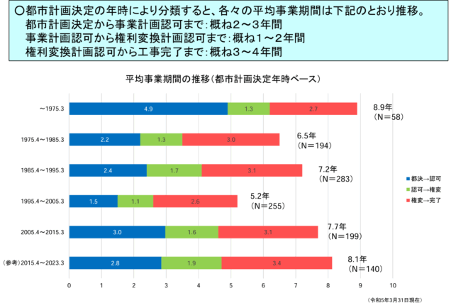 すると、以下の通り大規模プロジェクトの都市計画決定から工事完了までに少なくとも約8年程度の年月を要することが分かります。